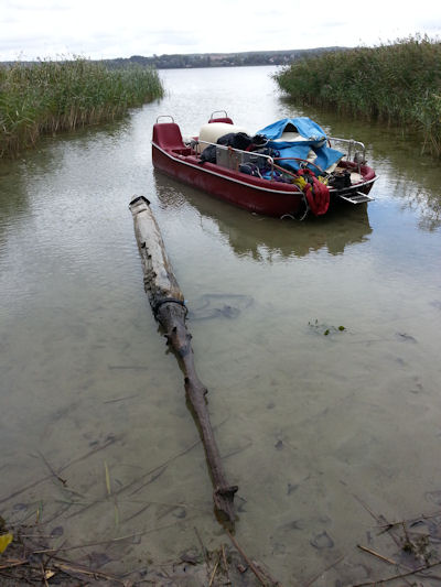 Inzwischen waren zusätzliche Hebesäcke organisiert worden, die als Dreierpaket zusammengefasst und zu einem großen Bündel gerollt wurden. Mit den zusätzlichen Druckgasbehältern und Schläuchen zum Befüllen der Auftriebskörper, der Tauchausrüstung und zwei Mann Besatzung war der Wassertreter an der Grenze seiner Tragkraft. An dem Pfahl war seit geraumer Zeit eine Boje befestigt, die ca. 1 m unter der Wasseroberfläche seine Position anzeigte. Sie diente auch als Ankerpunkt für das Wasserfahrzeug. Mit Hilfe des GPS am Ziel angelangt, wurde zuerst der Wassertreter an der Boje befestigt. Die Hebesäcke wurden zu Wasser gelassen und mit Hilfe der Schläuche kontrolliert versenkt, die Tauchausrüstung angelegt und der Tauchgang konnte beginnen. Die Sicht war relativ gut, 1-2m horizontal und damit völlig ausreichend, wenn am Grund nicht zuviel Sediment aufgewühlt wurde. Da der Pfahl 1,8 m über den Grund aufragte, konnte der bewährte Webleinstek ohne Schwierigkeiten übergeworfen