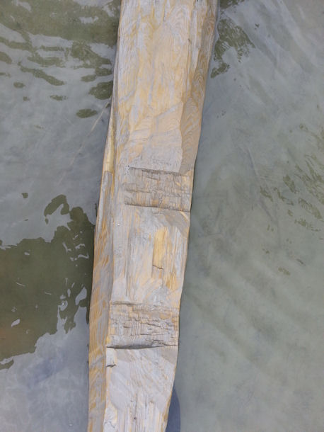 ehemaligen Brückenpfeilers auf, der an dieser Stelle vor fast 1000 Jahren den Weg in die Tiefe nahm. Langsam sackte er zurück, um sich dann flach unter die Wasseroberfläche zu legen. Nach so langer Zeit der vergeblichen Versuche war es ein erhebender Anblick, selbst die just in diesem Augenblick vorbeiziehenden Segler machten große Augen! Der Pfahl schwamm noch, selbst nach so langer Zeit! Wir banden ihn längseits an den Wassertreter, den er vorn und achtern um mehr als einen Meter überragte und machten uns auf den Weg zu der Badestelle „Kahl Flach“, an dem er vorsichtig angelandet, fotografiert und grob vermessen wurde. Der im Grund steckende Teil misst rund vier Meter bei einem durchschnittlichen Umfang von ca. 70cm. Interessant sind zwei waagerechte, mit Beil oder Axt hergestellte Einkerbungen ein Stück oberhalb des zugespitzten Endes. Sollte hier ein Gewicht befestigt worden sein, um den Pfahl bequem und sicher an seinen vorgesehenen Platz bugsieren und den