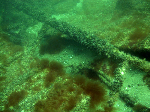 Erstes Ziel unseres Pfingstausflugs war ein östlich von Zingst liegendes Wrack, welches sich 400 m von der Küste entfernt in etwa 5 m Wassertiefe befindet. Auf Anhieb fanden wir das Skelett des alten Holzsegelschiffs. Der Schiffsrumpf ist etwa 27 m lang und in regelmäßigen Abständen ragten mannshohe Spanten aus dem Ostseegrund.
