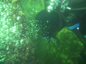 Während der Fahrt zur Untergangsstelle beobachtete ich die Schaumkronen auf den Wellenspitzen. Unser Schlauchboot hüpfte von einem Wellenberg zum nächsten und salzige Gischt spritze uns ins Gesicht. Als die Küstenlinie langsam am Horizont verschwand, kreuzte ein Schiff der Küstenwache unseren Kurs. Nach etwa 45 min Fahrt erreichten wir den Tauchplatz. Die Ostsee beglückte uns hier mit einer Sichtweite von knapp 8 bis 10 m. Nicht so angenehm war die Wassertemperatur von unter 4° C am Grund. Der „Ewer von Wismar“ liegt in 21 m Tiefe. Durch den geringen Sauerstoffgehalt in dieser Tiefe blieb das Wrack gut erhalten. Auch die Ladung - die aus Lehmziegeln bestand – ist noch gut zu erkennen. Nur die beiden Maste haben sich teilweise im Schlamm vergraben.