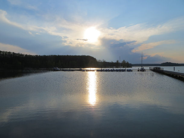 Nach dem Tauchen kann man im Maritim Hafenhotel Rheinsberg entspannen und von verborgenen Schätzen träumen. Hier vom Ufer des Hafendorfs Rheinsberg hat man einen schönen Blick auf die ca. 1.100 m entfernte sich Remusinsel.