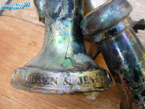Bisher konnten wir das von uns gefundene Wrack noch nicht identifizieren. Einen entscheidenden Hinweis könnten aber die im Wrack gefundenen Bierflaschen bieten. Sie tragen die Aufschrift „Petersen & Jensen“. Allerdings konnten wir noch keine Brauerei mit dem Namen „Peterson & Jensen“ ausfindig machen. Hinweise, die zur Identifizierung des Schiffswracks führen, nehmen wir gern entgegen!