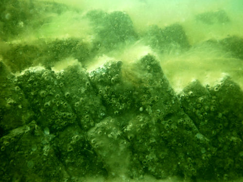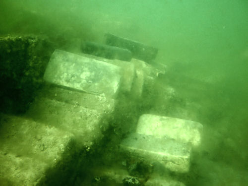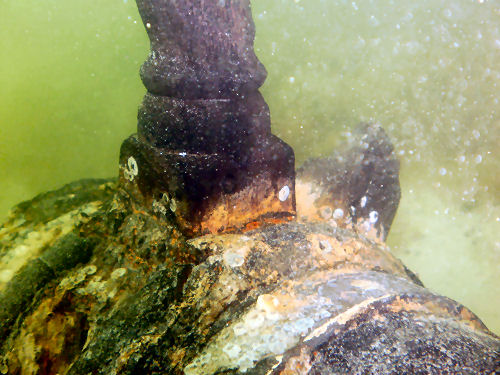 In diesem Sommer haben wir ein neues Wrack betaucht. Bereits beim ersten Tauchgang konnten wir das unbekannte Wrack in 4 bis 5 m Tiefe vor Dierhagen lokalisieren. Es handelt sich um ein doppelt beplanktes Holzschiff mit einer Ladung fein säuberlich gestapelter Ziegelsteine. Der gute Zustand des Wracks lässt darauf schließen, dass das Wrack bisher von Plünderern verschont blieb. Wir fanden sogar noch die Reste des messingbeschlagenen Steuerrads.