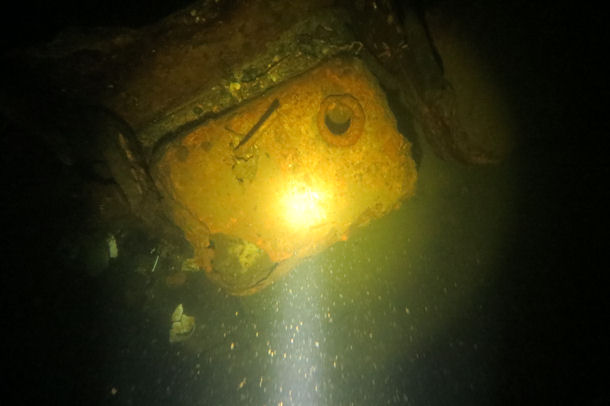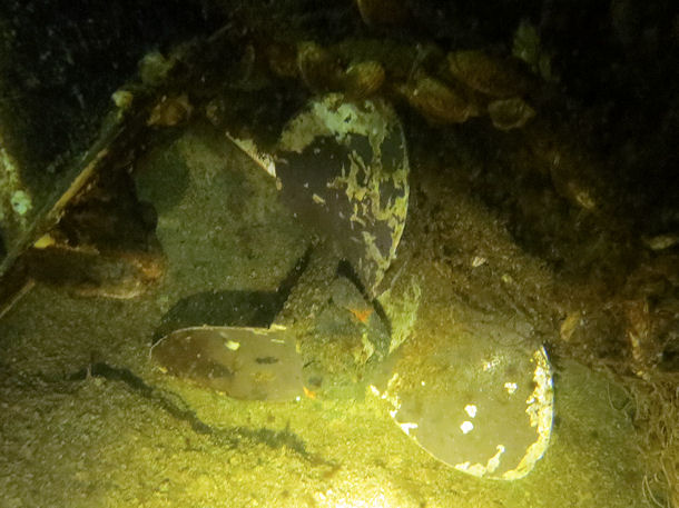 Vor der Alten Fischerei von Altenhof liegt in 33 m Tiefe das Wrack eines versunkenen Fischerboots auf dem schlammigen Grund des Werbellinsees. Der Lichtkegel meiner Lampe wanderte über einige Kisten und Fischernetze. Das Wrack ist fast vollständig im Schlamm versunken. Es schaut nur noch ein Teil der Bordwand hervor. Die Schiffsschraube war freigelegt und deutlich zu erkennen. Sie ließ sich noch drehen.