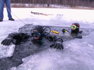 Strahlend blauer Himmel, Sonnenschein und eine herrliche Winterlandschaft betteten die eisbedeckte "Katja" ein. Wird das Eis uns tragen? Schnell stürzten wir zum Ufer und stellten fest, dass man - anders als noch beim Weihnachtstauchen am 15. Dezember - gefahrlos über´s Eis schlittern konnte. Zunächst einmal mussten aber zwei Löcher ins Eis gesägt werden. Bei der 15 cm dicken Eisschicht war das eine schweißtreibende Arbeit! Dann kam aber das schwierigste Unterfangen: die Schollen herausheben. Kaum war das Loch fertig, machten sich schon die einzig wirklich Tapferen, die Nasstaucher bereit. Insbesondere die zuvor abgesprochenen Leinensignale wurden noch einmal wiederholt.
