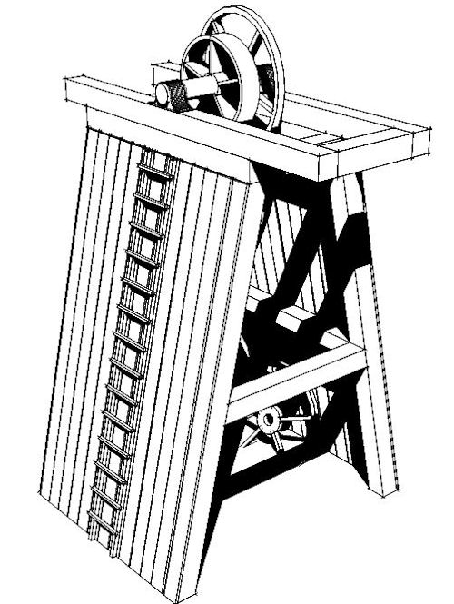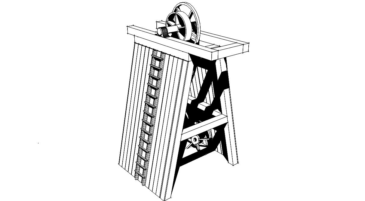 Im hinteren Becken des Sees stieß ich vor Jahren zufällig auf einen mehrere Meter hohen hölzernen Förderturm. Ich tauchte im 4-5 m Bereich und entdeckte zuerst eine im Schlamm liegende Lore. Dann folgten dicke Balken und Rohre, denen ich folgte. Nach einigen Metern erreichte ich eine Art Turm auf dessen Spitze sich eine gewaltige, senkrecht gerichtete Seilrolle befindet.