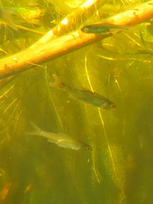 Nahe der Oberfläche im pflanzenbestandenen Uferbereich stehen Schwärme kleine Moderlieschen (Leucaspius delineatus), auch Sonnenfischchen, Zwerglaube oder Malinchen genannt. Der Name Moderlieschen ist etwas irreführend. Er ist nicht von Modder oder Schlamm abgeleitet, sondern kommt von „mutterlos“, weil der Laich manchmal am Fuß von Wasservögeln hängen bleibt und dann in andere Gewässer verschleppt wird, wo das Gelege dann mutterlos ist.