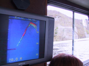 Das „Ungeheuer“ wurde am meisten bei Castle Urquhart gesichtet. Also begab ich mich auch dort auf die Suche nach Nessie – doch die Sonarechos zeigten keine Anomalien... Abgesehen davon war meine CF-Karte des Fotoapparats voll und als ich durch Löschen von anderen Fotos etwas freien Speicherplatz geschaffen hatte, war der Akku leer. Also selbst wenn Nessie aufgetaucht wäre, hätte ich keinen Beweis.