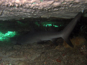 Alle weitere Tauchgänge dieser Reise unternahm ich vor den Inseln Nusa Penida und Nusa Lembongan. Die beiden, von unzähligen Palmen und weißen Sandstränden umsäumten Inseln liegen etwa eine Stunde Bootsfahrt westlich von Bali. Zwischen den Inseln befindet sich ein Kanal, in dem eine kräftige Strömung herrscht. Ich hörte, dass dort die Riffhaie so zahlreich sein sollen, dass man ihnen nach einer Weile keine Aufmerksamkeit mehr schenkt. Außerdem werden dort häufig Mantas und Mondfische gesichtet. Kaum abgetaucht erfasste mich ein drei bis vier Knoten starker Sog. Vorbei an wunderschönen Gorgonien, Weichkorallen und bunten Schwämmen sauste ich durch einen üppigen Korallengarten und tatsächlich traf ich gleich beim ersten Tauchgang auf mehrere Weißspitzenriffhaie.