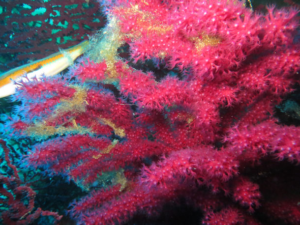 Ich tauche zurück zum Riff, welches über und über mit herrlichen roten Gorgonien, gelben Krustenanemonen und orange-gelben Schwämmen bewachsen ist. Die Sicht ist außerordentlich gut. Nicht nur das kristallklare Wasser, sondern auch der Bewuchs erinnert mich ein wenig an karibische Riffe. In der Meerenge von Bonifacio, die Sardinien und Korsika voneinander trennt, besitzt das Wasser eine große Reinheit und bietet Korallen einen idealen Lebensraum. Bereits bei vorherigen Tauchgängen sah ich mehrere Langusten, die mir ihre langen Antennen entgegenstreckten, schöne Nacktschnecken und Gorgonien. Leider fehlten die großen Fische. Ich hatte nur einen kapitalen Zackenbarsch gesehen. Dies ist wohl darauf zurückzuführen, dass in Italien das Sperrfischen noch erlaubt ist und sich einer außerordentlichen Beliebtheit erfreut.