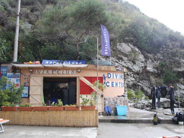 Absolut malerisch liegt in der Bucht der Isola Bella unterhalb von Taormina, die familiär geführte Tauchbasis Nike Diving. Die 136 Stufen zum Strand und zur Basis lassen sich gut bewältigen. Die Tauchplätze sind in wenigen Minuten mit dem Boot zu erreichen.