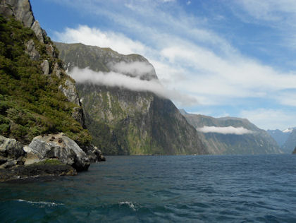 Gesäumt von steil aufragenden Felswänden an denen zahlreiche Wasserfälle herabdonnern, ragt der Fjord des Milford Sound 15km in das Landesinnere hinein