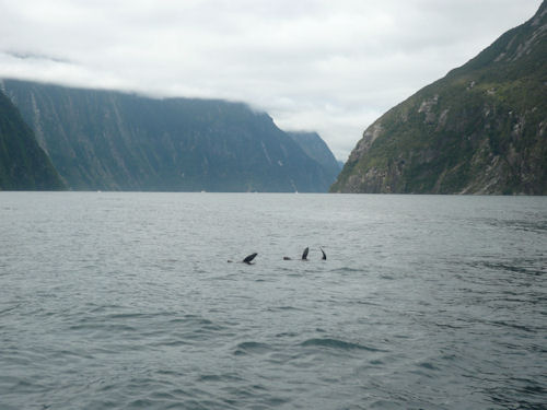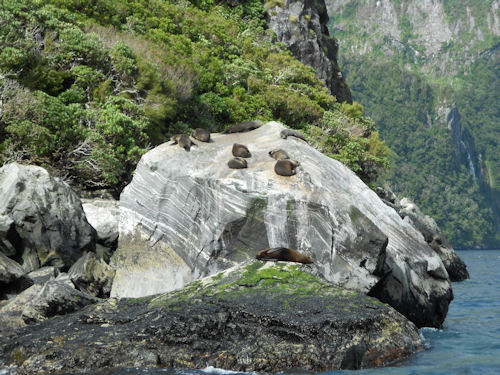 Mit dem Boot geht es am nächsten Morgen tief durch die Fjordlandschaft mit atemberaubender Aussicht auf hohe Berge und spektakuläre Wasserfälle. Am bekanntesten ist hier der Mitre Peak, der mit einer Höhe von 1692 m zu den höchsten Bergen rund um den Milford Sound gehört und direkt an der tiefsten Stelle des Fjords (265 m) liegt. Wir haben hervorragendes Wetter mit blauem Himmel und Sonnenschein. Die klare Sicht ist beeindruckend und wir können weit in den Sound hinein sehen. Der Nachteil an dem tollen Wetter ist, dass es im Sound nur wenige Wasserfälle zu sehen gibt, bei Regenwetter können es hunderte sein.
