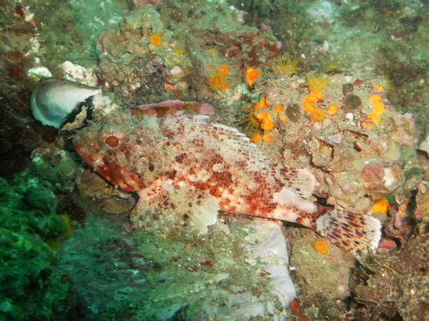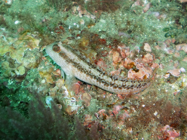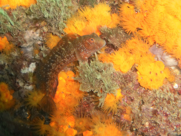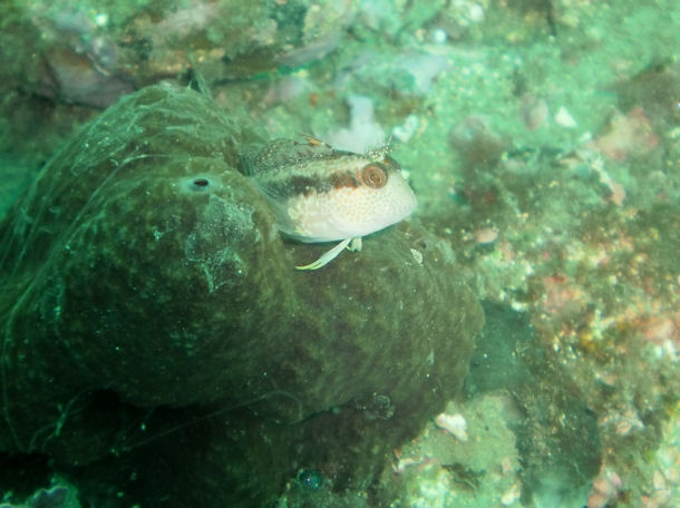 Zwischen dem Geröll verstecken sich farbenfrohe Schleimfische (z.B. Vandervekeni-Schleimfisch, Hahnenkamm-Schleimfisch oder Grauer Schleimfisch).