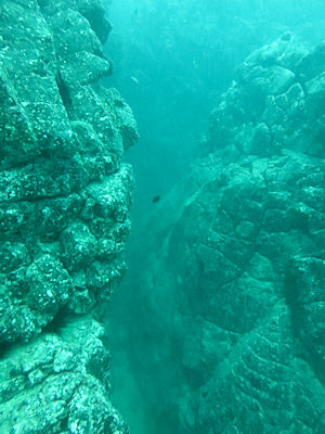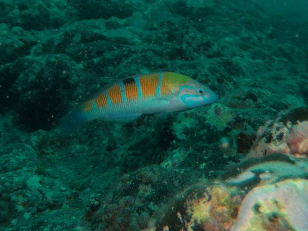 Aufgrund der rauen See war die Sicht etwas eingeschränkt. Ich schätze die Sichtweite auf 10 bis 15 m. Als wir uns durch Dünung und Strömung am Strömungsseil in die Tiefe vorgearbeitet hatten, erwartete uns eine spektakuläre Unterwasserlandschaft mit zerklüfteten Steilwänden, Spalten und kleinen Grotten. Hier traf ich auf kleine Riffbarsche, insbesondere Mönchsfische (Chromis chromis) und blaue Kanaren-Demoisellen (Abudefduf luridus). Farbe ins Riff bringen auch die Lippfische, z.B. der flinke Meerpfau (Thalassoma pavo) mit seinem auffälligen, ornamentartigen Kopfmuster und bläulich-grünen Streifen auf dem Körper.