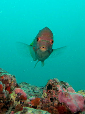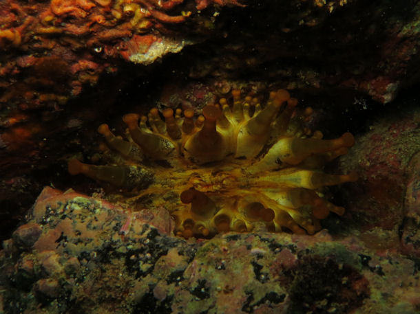 Hier traf ich auch den Roten Schweinslippfisch (Bodianus scrofa). Dieser ebenfalls aus der Familie der Lippfische stammende Fisch kommt nur in den Gewässern der Makaronesischen Inseln (Azoren, Kanarische Inseln, Kapverdische Inseln, Madeira) vor. Immer wieder sah ich farbenfrohe König-Sägebarsche (Serranus atricauda) und mehrere Braune Zackenbarsche (Epinephelus marginatus). Aufgrund ihrer Größe waren sie am Riff nicht zu übersehen. Die Braunen Zackies zeigten hier wenig scheu. Ein Tauchpartner sah auch einen großen Rochen.