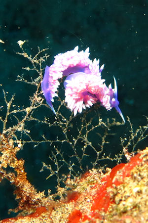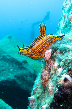Die Wracks bieten schöne Fotomotive. Zwischen den Schiffsüberresten fanden wir allerlei Getier wie Drachenköpfe (Scorpaena elongata), Nacktschnecken Hypselodoris picta und Zackenbarsche (Epinephelus marginatus).