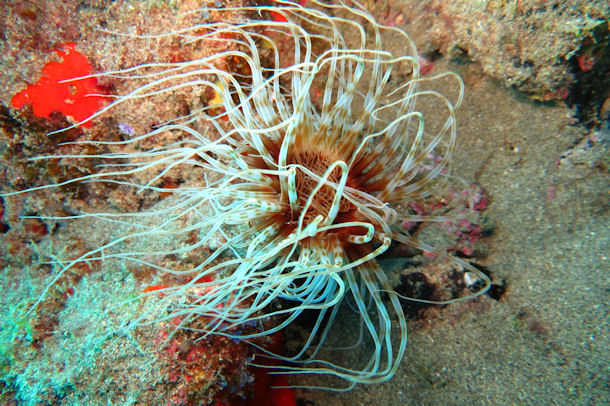 Der exotische Name des Tauchplatzes verspricht viel. Und tatsächlich bot das Waikiki-Riff tropische Eindrücke. Die Kanaren bilden die Schnittstelle zwischen nordatlantischer und tropischer Flora und Fauna. Rote Kanaren-Seesterne (Narcissia canariensis), Anemonen (Isarachnanthus cruzi) und gelbe Schwämme boten schöne Farbtupfer am Fels. Selbst eine Orangene Koralle gibt am Waikiki-Riff.