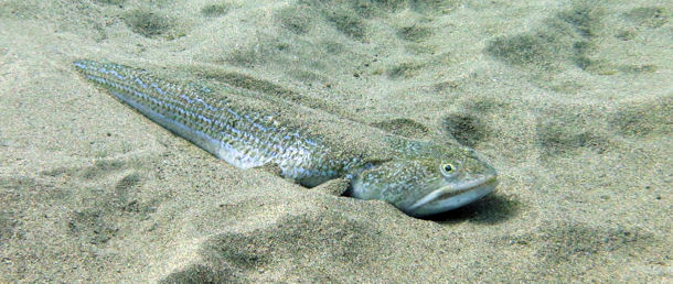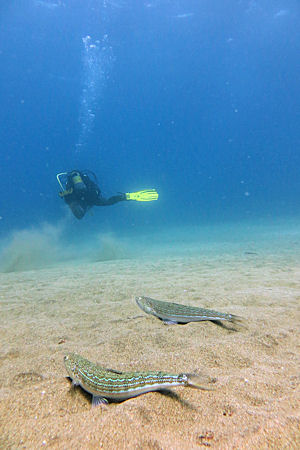 Der Rückweg verlief entlang einer Lavazunge über einen flachen sandigen Untergrund auf dem Petermännchen (Trachinus draco/ T. radiatus) und Eidechsenfische (Synodus saurus) lagen. Beide Arten sehen auf den ersten Blick recht ähnlich aus. Sie graben sich häufig in den Sand ein, so dass nur der Kopf hervorschaut. Im Gegensatz zum ungefährlichen Eidechsenfisch haben die Petermännchen giftige Stacheln am Kiemendeckel und an der vorderen Rückenflosse. Der Stich verursacht sehr starke Schmerzen und kann in Extremfällen den Taucher sogar in Lebensgefahr bringen. Also Achtung.