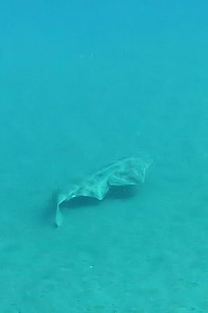 Zunächst tauchten wir über eine kleine Felsgruppe den Sandabhang in Richtung Felsriff ab. Immer wieder schaute ich auf den Sandgrund, da hier oftmals Stachelrochen, Schmetterlingsrochen, Zitterrochen oder Engelhaie anzutreffen sind. Und tatsächlich zog bereits am Anfang des Tauchgangs ein ca. 1,20 m langer Engelhai (Squatina squatina) gemächlich an uns vorbei. Der auch als Meerengel bekannte Hai hat einen stark abgeflachten Rumpf, wodurch er eher wie ein langer Rochen als ein Hai wirkt. Meist liegen den Engelhaie auf dem Meeresgrund oder graben sich in den Sand ein, um auf Beutetiere zu lauern.