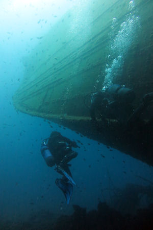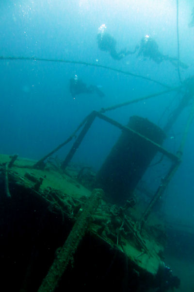 Die anderen sechs Wracks kann man problemlos betauchen. Sie liegen dicht nebeneinander in Tiefen zwischen 12 und 40 m. Wir betauchten zuerst die tieferliegenden Wracks, um dann den Tauchgang bei den Wracks nahe der Oberfläche zu beenden. Kurioserweise sind die im flachen Wasser liegenden Schiffe besser erhalten. Sie liegen direkt an der Außenmole des Hafens von Puerto del Carmen. Eines der Wracks wurde bei der künstlichen Erweiterung des Wellenbrechers von Puerto del Carmen leider zur Hälfte verschüttet.