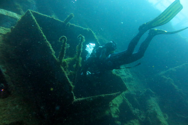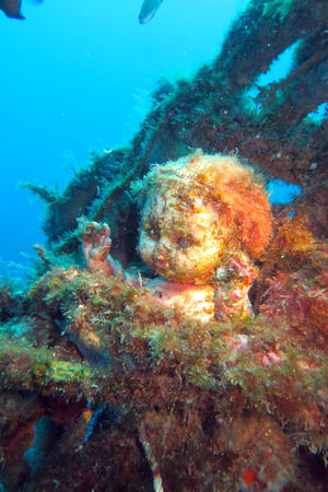 Zum Teil kann man auch in das Innere der Wracks schwimmen. An einem Wrack wurde es sogar richtig schaurig. Hier trafen wir zwischen den Aufbauten auf Chucky, die Mörderpuppe, die wohl irgendein Taucher hier hinterlassen hat.