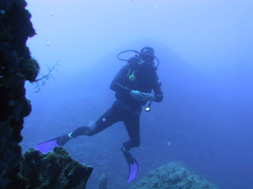 Auf dem Rückweg kann man entweder direkt durch den Canyon zurück und wirft dabei noch einmal einen faszinierenden Blick auf das Wrack. Oder man taucht ein Stück weiter nach links und kann dort durch einen Tunnel und einen sehr schmalen Kamin, durch den immer nur ein Taucher passt, auf ungefähr 14 m wieder aufsteigen. Anschließend kann man noch an der Kante des Plateus austauchen und dann geht es wieder zum Boot zurück. Ein Top-Tauchplatz!