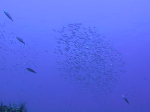 Über die großen friedhofsanmutenden Steckmuschelfelder ziehen Schwärme von Stachelmakrelen. Die Große Bernsteinmakrele (Seriola dummerili) ist hier - wie im gesamten Mittelmeer - die am häufigsten vorkommende Stachelmakrelenart. Ihr Erkennungsmerkmal ist der dunkle schräge Streifen, der vom hinteren Kopfbereich über das Auge zum Maul führt.