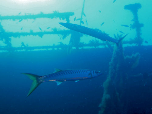 Ich tauchte dann in 34 m Tiefe entlang der Heckklappe und erreichte das offene, obere Ladedeck im hinteren Teil des Schiffes. Hier liegen mehrere Lkw´s über die große Zackenbarsche patroulierten.