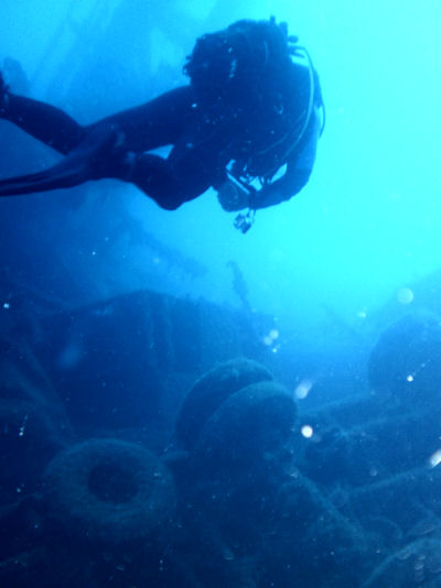 Im Inneren des Schiffs soll man dann auf dem unteren Ladedeck auf eine Vielzahl von Lkw´s stoßen. Beim ersten Tauchgang wollte ich jedoch noch nicht ins Innere des Wracks eindringen, sondern mir zunächst ein Bild vom Tauchplatz machen. Bereits nach einer halben Stunde Tauchzeit musste ich meinen Aufstieg zurück an die Oberfläche beginnen. Zwar hatte ich eine 15 l Flasche auf dem Rücken, doch viel zu schnell gelangt man hier in die Deko-Zeit.